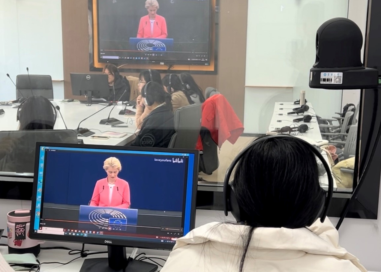 从麦克风到耳机,从电子屏到多线路转接面板,同传实验室配备的专业设施一应俱全。置身其间,我们能立刻感知到同传现场的氛围。身处同传箱中,由于视野受限且极度安静,注意力高度集中。伴随着紧张感而来的是兴奋,我觉得进入了一种玄妙的状态。除了自己和耳机里的声音,世界再无其他。同传,实在是一种令人上瘾的存在。