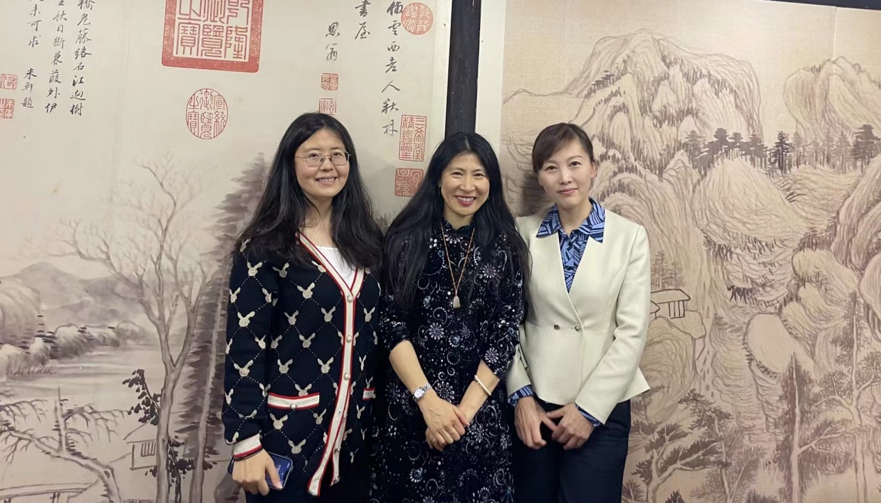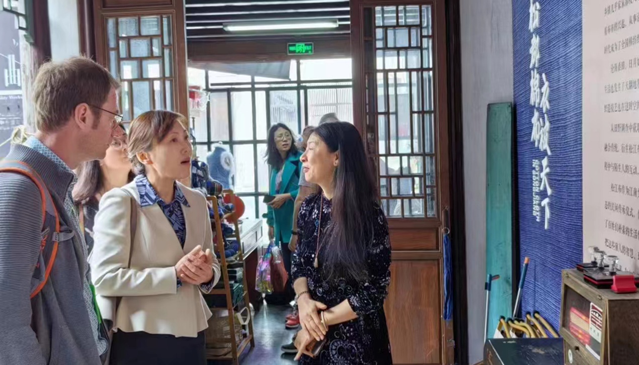 张曦一行与黄道婆纪念馆馆长刘垚、顾问方云围绕纺织非遗文化的传承与传播进行了深入交流与探讨。双方更深刻地体会到创新对社会发展所产生的深远影响,强烈地感受到传承和传播非遗文化的责任感与使命感。纺织类非遗体现了上海独特的创造力和感染力,蕴含着深邃的文化基因,是人民智慧的结晶,外语人只有深入认知上海纺织类非遗的艺术魅力和纺织科技创新发展的历程,才能真正向世界阐释推介好具有中国特色、体现中国精神、蕴藏中国智慧的优秀纺织文化。